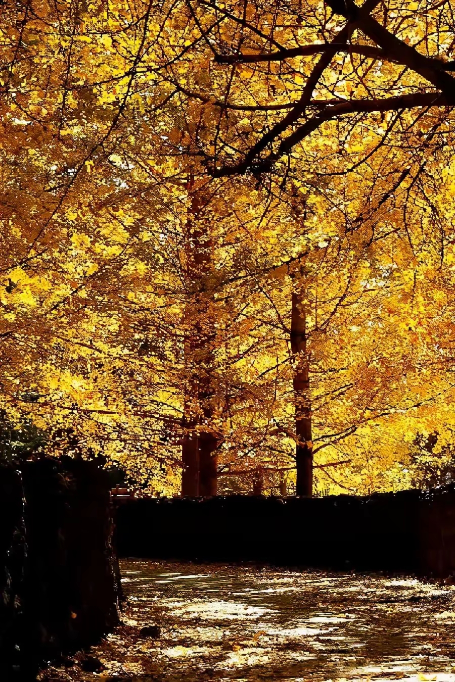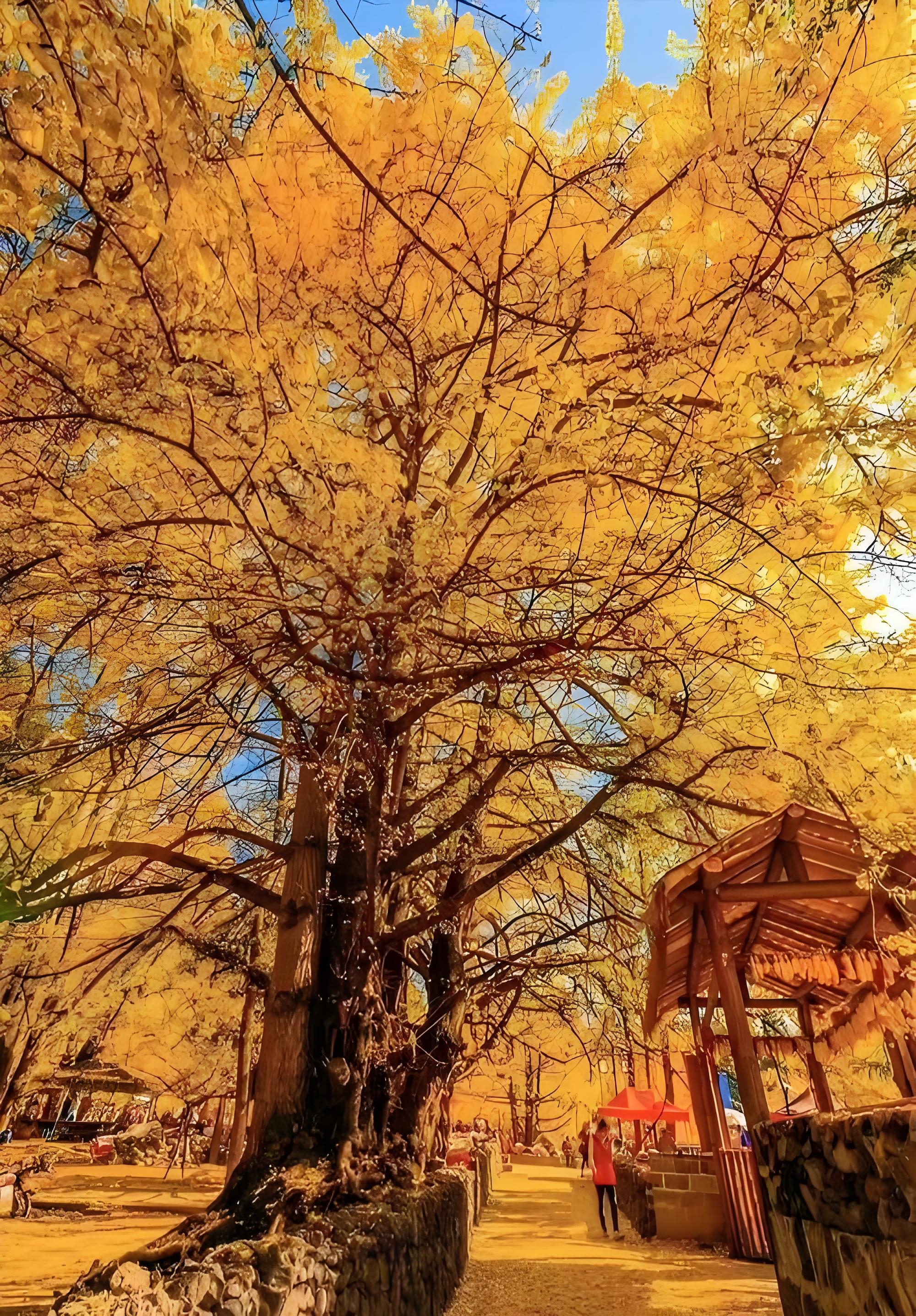 3万余株银杏毫不吝啬地变黄,落叶给路面铺上了金色的地毯!据说最老的一棵树,树龄已经有1300年以上,撑起一把金色的大伞。