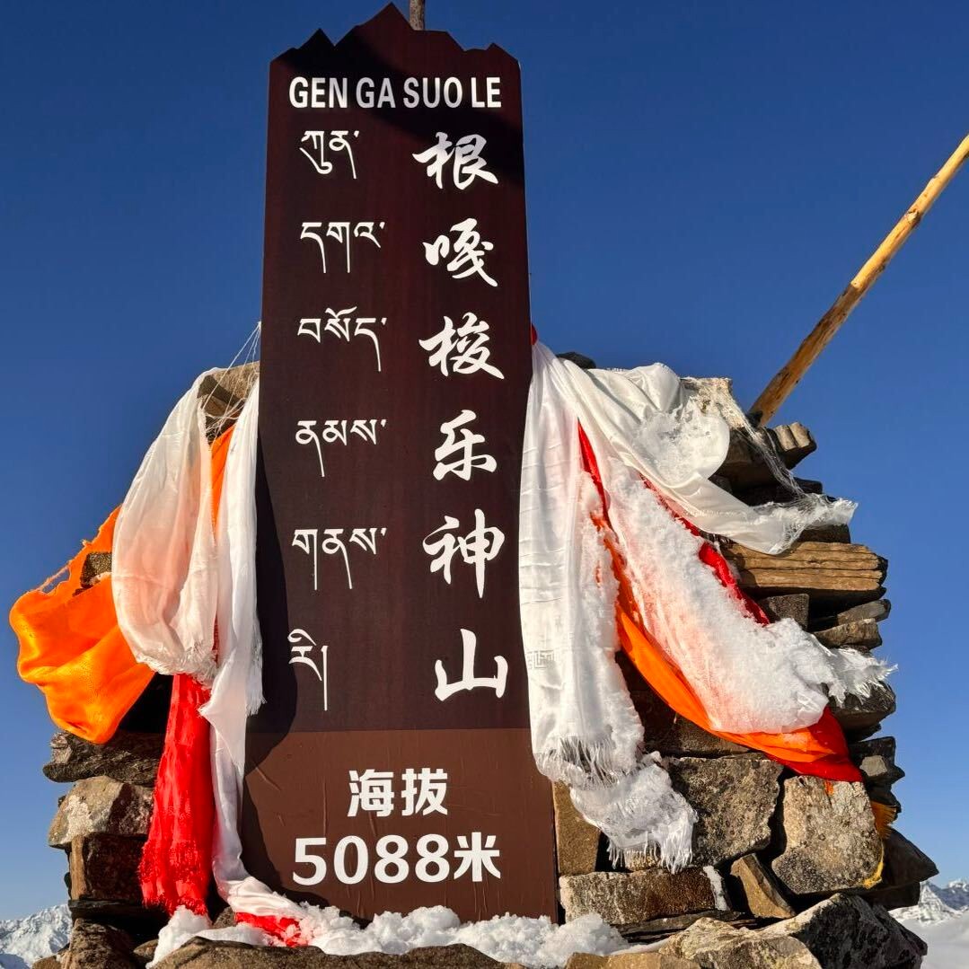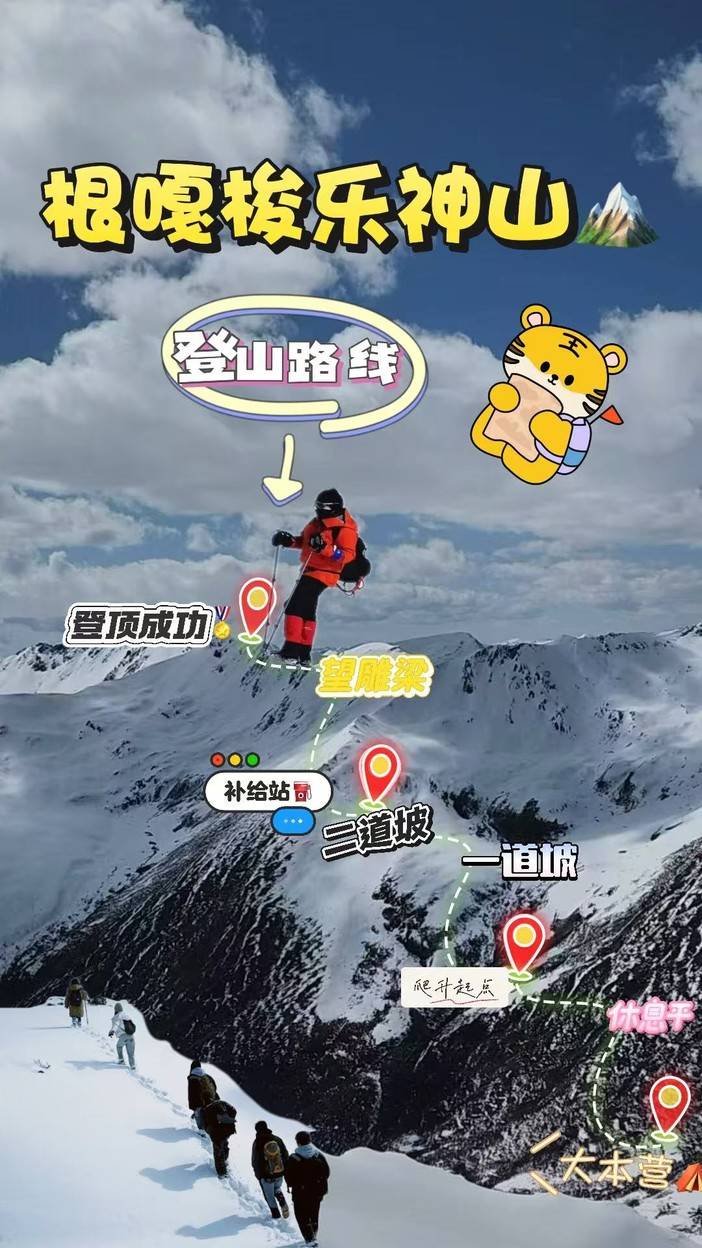 D1.12月6日早上8点汽车总站出发,8.15分华尔街加油站,8.30分园艺山人工湖,中午路途A餐,下午3点左右到达两河口先锋村营地休息,住宿营地海拔3600米。D2.早上3点起床吃早餐,3.30分座中转车出发到登山起点路途7公里,爬升起点海拔为4200米从爬升起点到顶峰路途接近7公里,爬升880米,中途在补给点休息补充物资和能量。预计中午12点左右下撤到营地,登顶海拔为5088米.登顶成功之后会得到一个登顶根嘎梭乐雪山🏅奖牌。